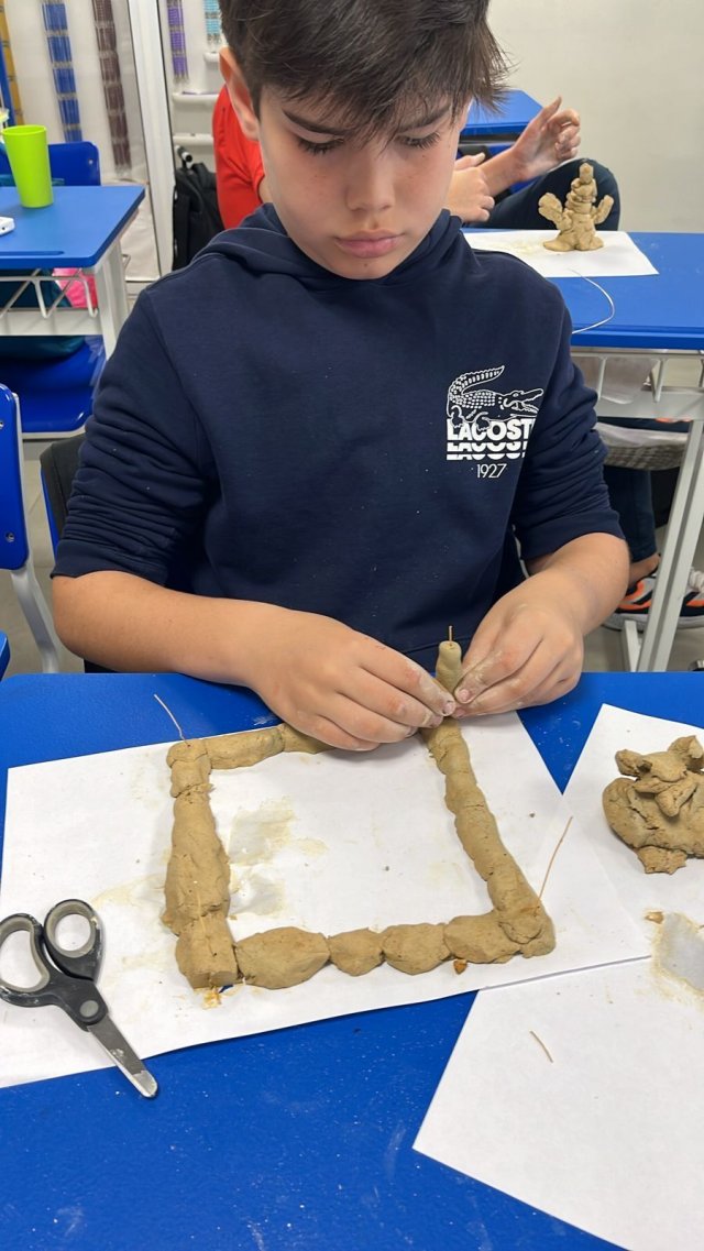 Colocando a mão no barro e utilizando o arame, vivenciaram na disciplina de Artes "Escultura e Movimento".
